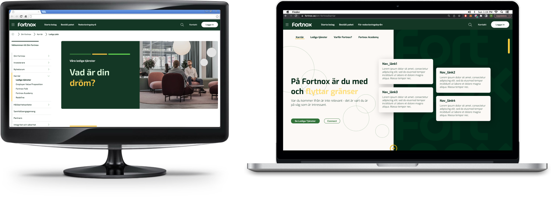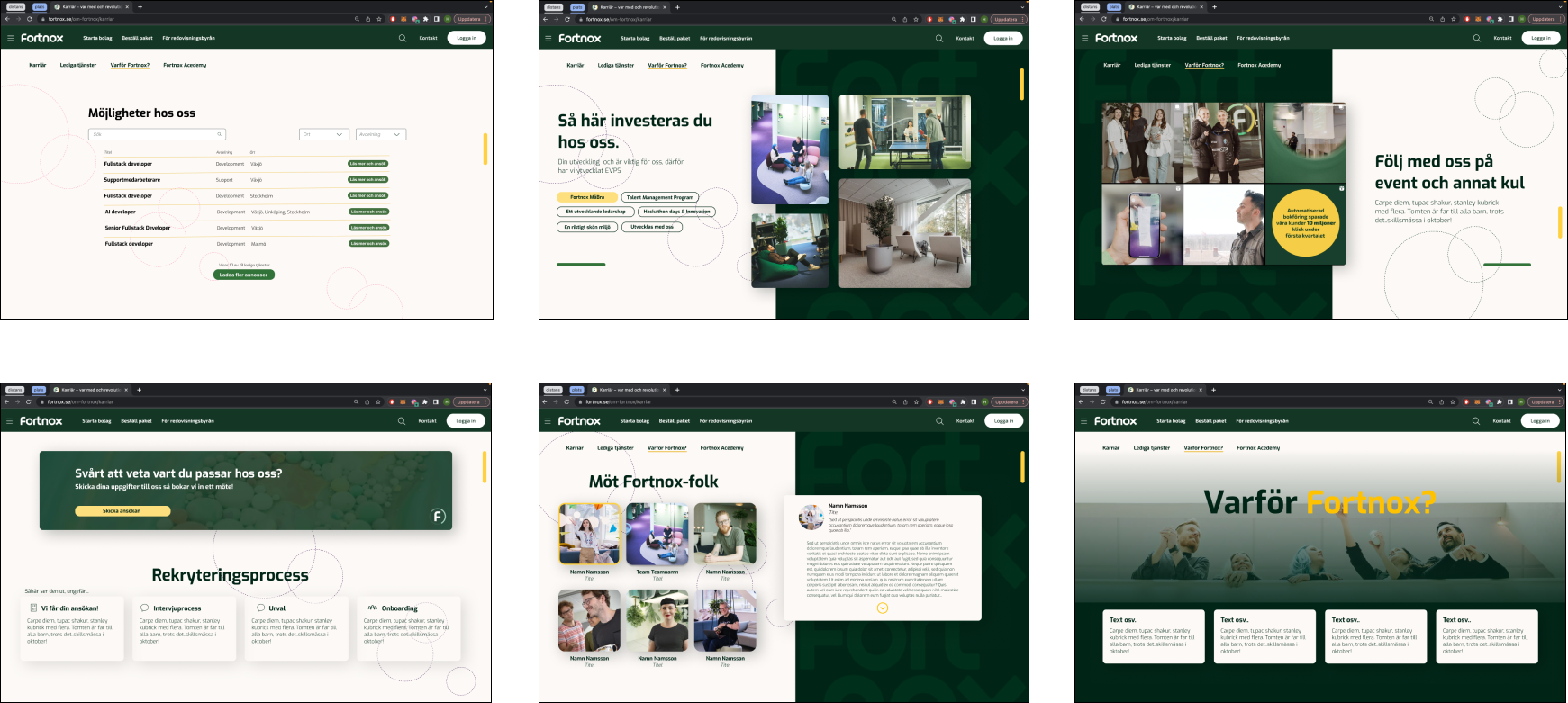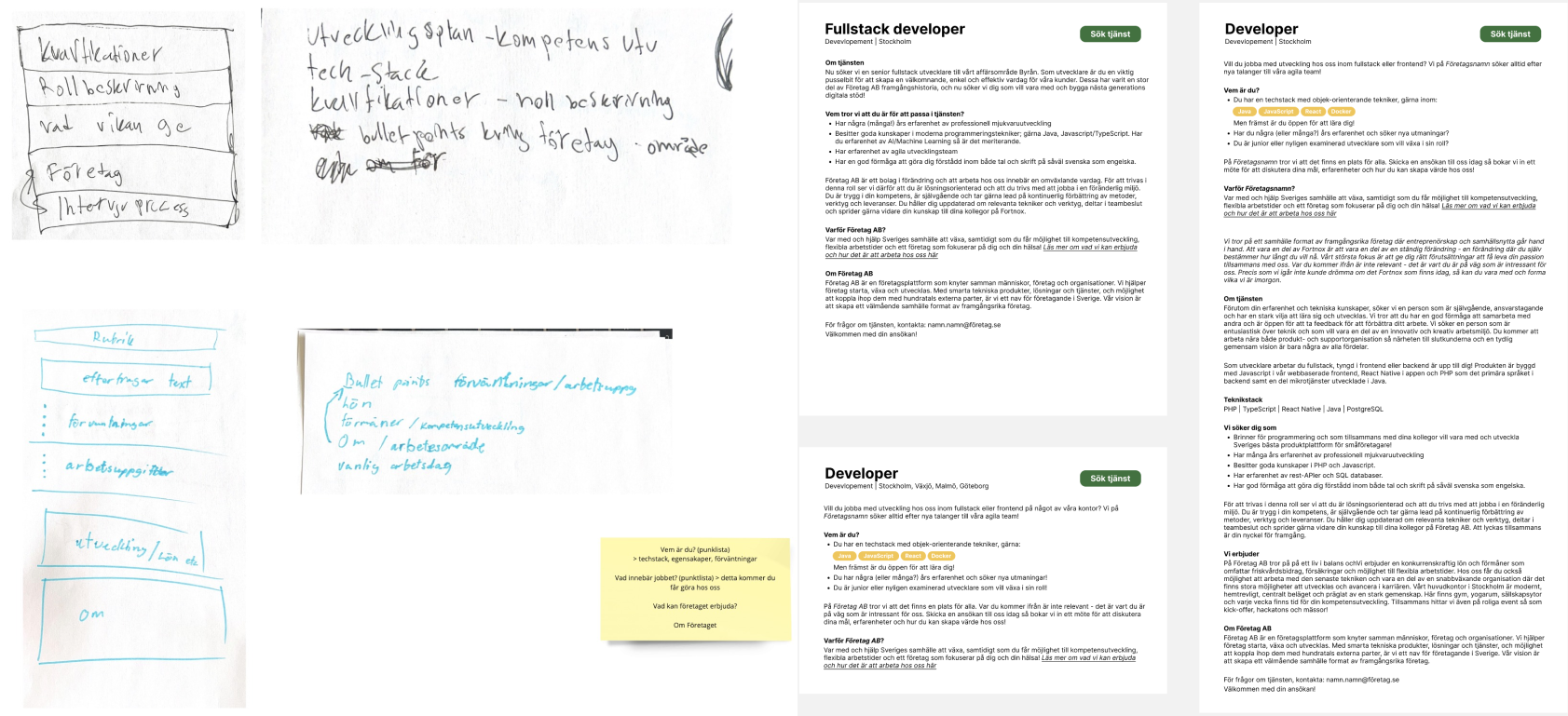 Our primary goal was to attract more developers while sustainably strengthening hiring across other roles. We mapped the recruitment process, identified friction points, and built two prototypes: a revamped career site and a data-driven job-ad template. The site concept introduced a streamlined listing view, an “Expression of Interest” option for unsure candidates, a transparent overview of the recruitment process, and content highlighting team dynamics, employee development, and event participation. The job-ad template clarified role expectations and key requirements to present a structured, accurate employer narrative. Together, these proposals modernize Fortnox’s career flow and align structure and content with the company’s values