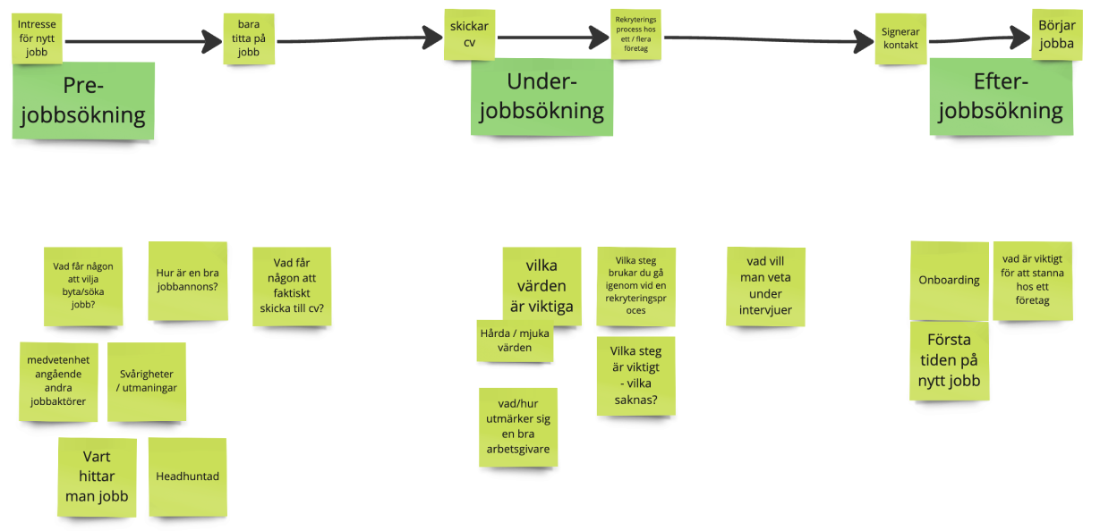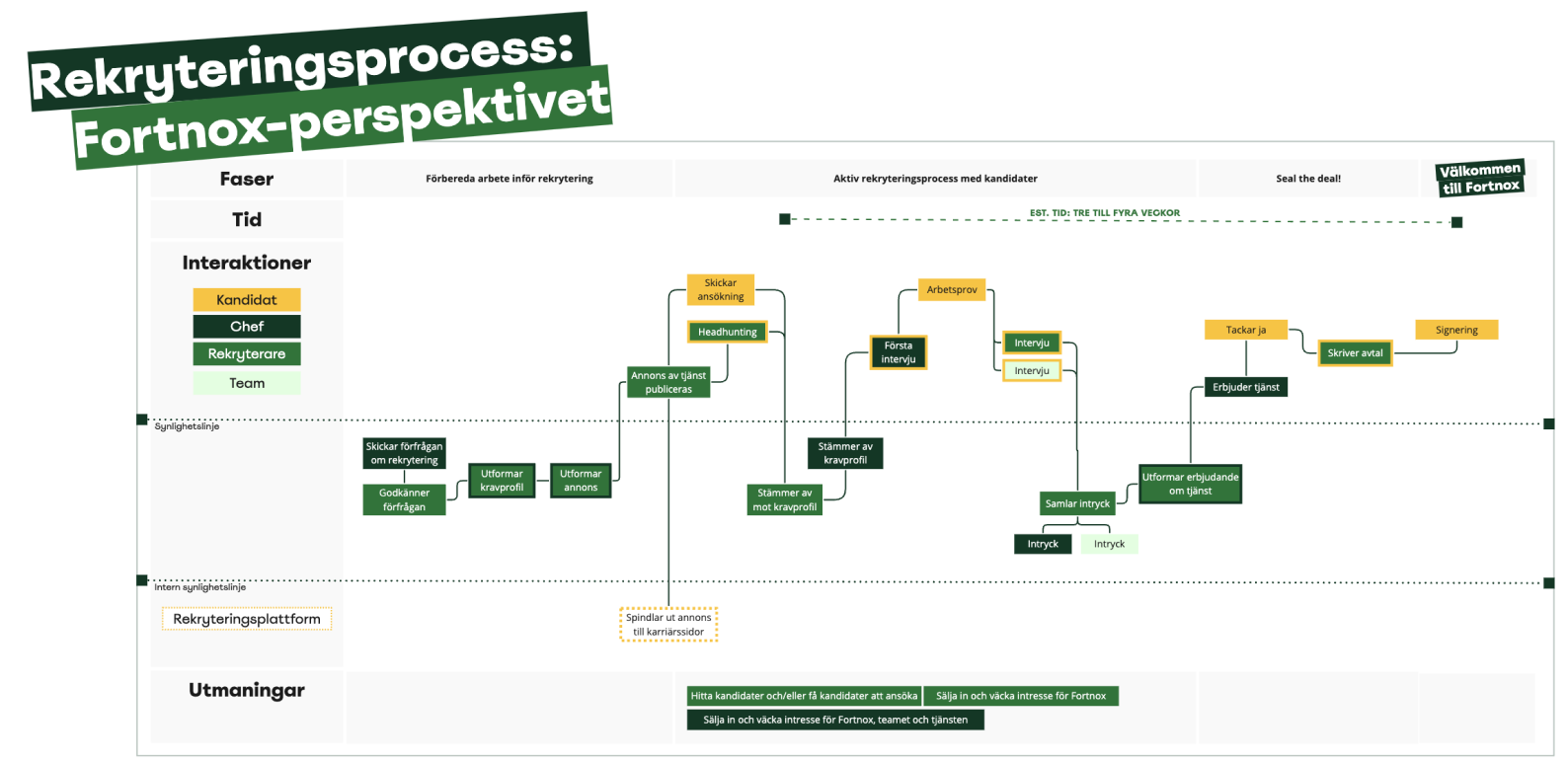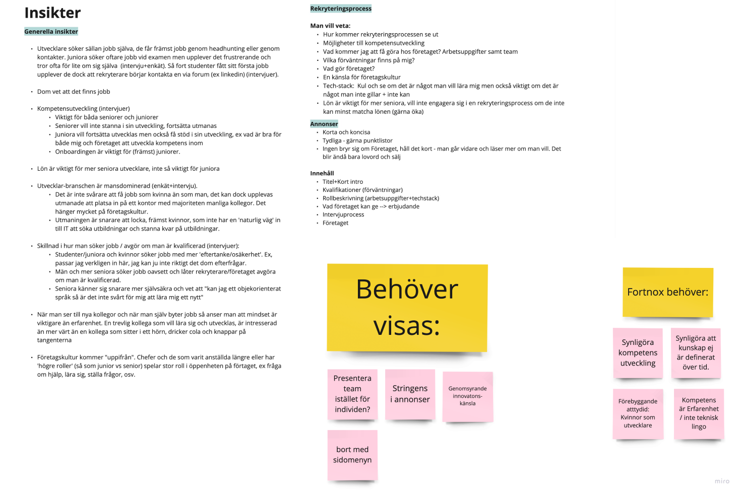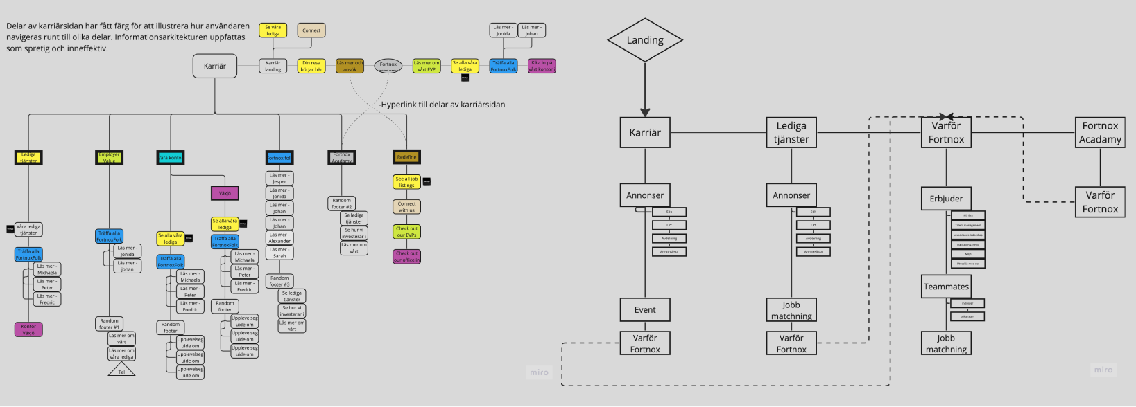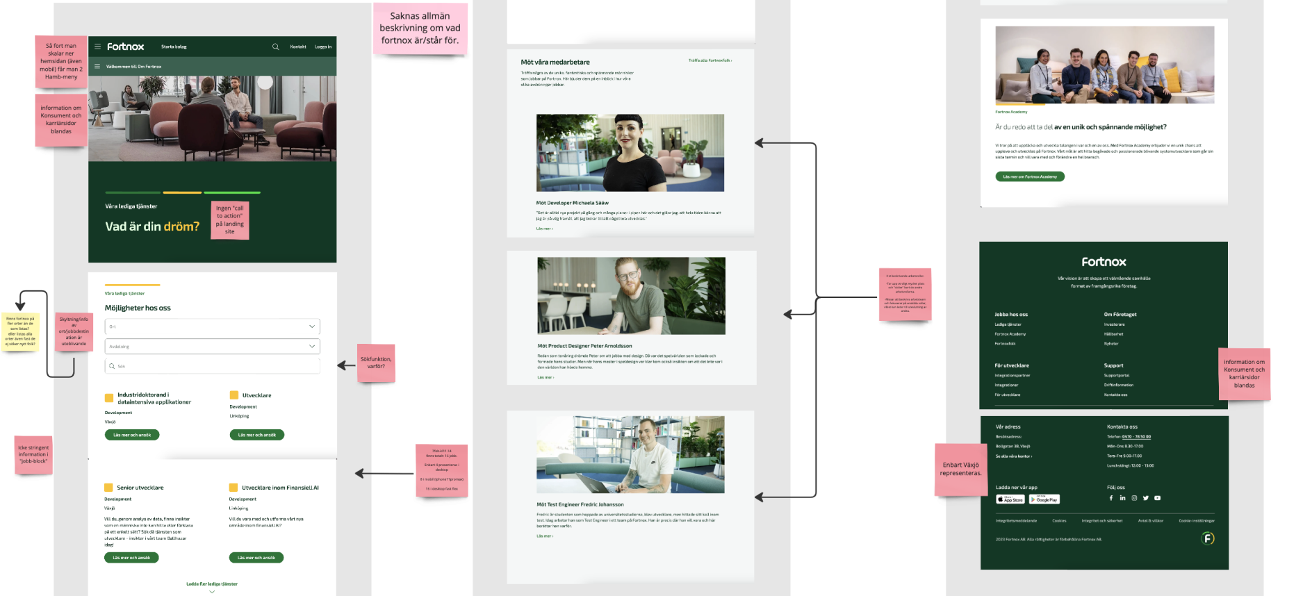 At the start of the project, we undertook a deep dive to understand Fortnox. The goal was to explore aspects such as the company's structure, the stakeholders influencing the career flow on the website, and the recruitment process. This was primarily achieved through desktop research, interviews with Fortnox employees, and mapping the recruitment process, which helped identify challenges and frustrations with the career flow.