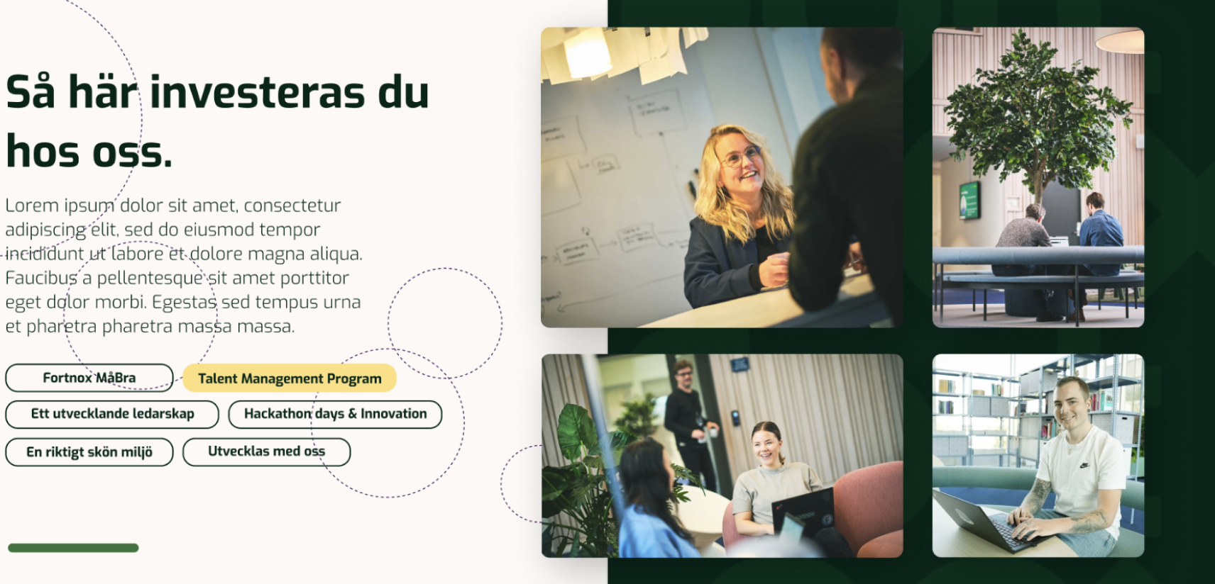The prototype focuses on visually representing Fortnox's values and identity as an employer. By aligning the website with the desired company culture, Fortnox can attract and engage candidates who resonate with their values. A well-designed website leaves a lasting impression on job seekers and reinforces Fortnox's image as a modern and forward-thinking tech company.
