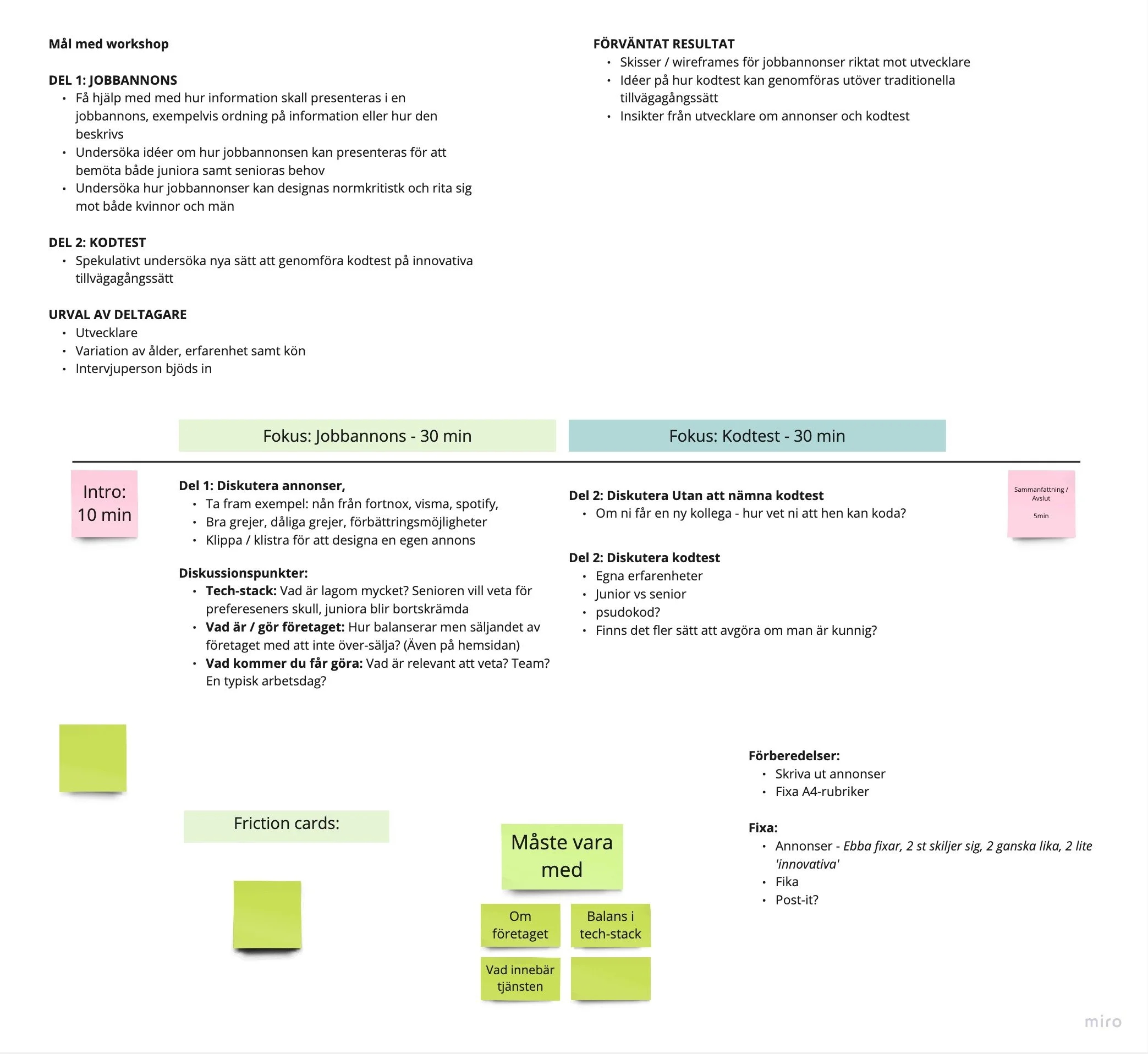 Participants, consisting of developers of varying ages, experiences, and genders, collaborated to 'enhance' the presentation of information in job adverts. They explored diverse ways of presenting information to meet the needs of both junior and senior candidates. As moderators, we utilized 'friction questions' to encourage participants to think norm-critically. For instance, we could highlight excerpts from literature or prompt them to role-play as individuals other than themselves.